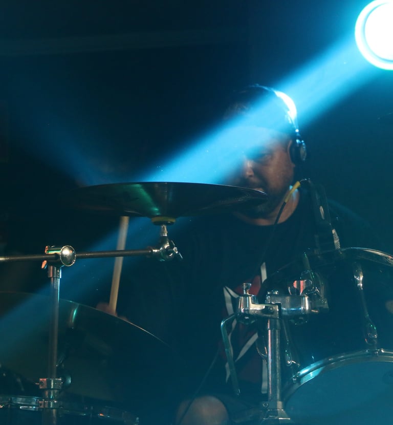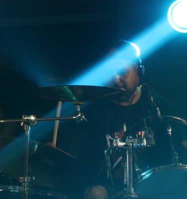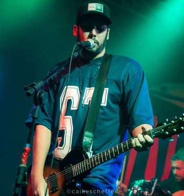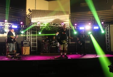 A band performs in a dimly lit venue, with the guitarist in the forefront wearing a plaid shirt and a hat, playing an electric guitar. In the background, a drummer and a bassist can be seen, all immersed in the performance. The stage is illuminated with colorful lights, creating a vibrant atmosphere.
